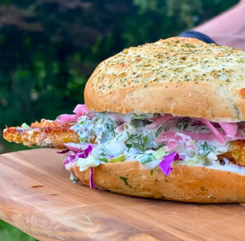 Sandwich m. vores hjemmelavede pankopanerede pastinak – også kendt som fredsfisk, hjemmelavet tatarsauce, cremet mayo, syltede rødløg og sprød spidskål