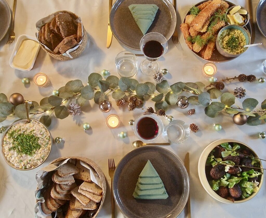 Hjemmelavet fredsfisk, rødbedecarpaccio, hønsefri-, tunfri- og æggefrisalat, tarteletter, deller, svampepaté og risalamande. Serveres med rugbrød og lyst brød